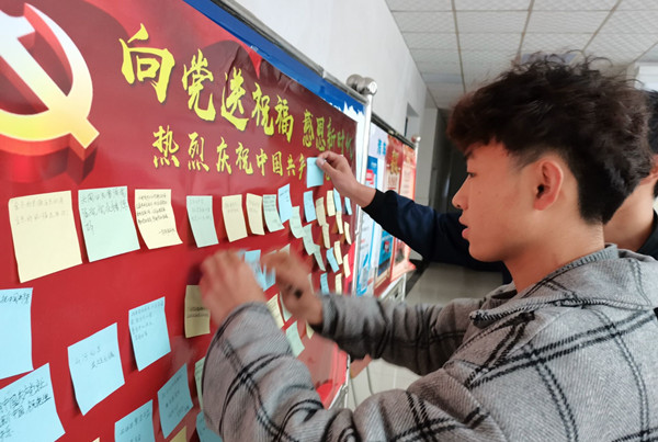 活动前期制作了祝福海报,通过太阳成tyc234cc分团委、员工会向广大同学宣传,并在活动现场向前来送祝福的同学们发放便利贴,邀请他们写上对党100周年华诞的祝愿。在课间时间,同学们纷纷将对党的感恩和美好祝福通过贴便签的形式张贴在展板上,表达对党的热爱与拥护。