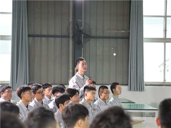 “王涛老师作为公司特聘教授经常与我们交流‘马灯精神’、工匠精神等内容,勉励我们干一行爱一行,精益求精做技术能手、现代工匠。您能结合自身经历跟我们讲讲,怎样才能真正把工匠精神学到心里、用在手上、落到实处呢?”面对同学们真挚的提问,王建清代表娓娓道来:“当初,我从部队转业来到东风汽车公司上班,一进厂里看到大门口一个大宣传标语上写着——‘像全国劳模王涛同志一样爱岗敬业’,当时就在心里想:王涛是谁?我连当上全厂劳模都很困难,能像王涛师傅一样该有多难啊?不知不觉28年过去了,我从被推荐为东风汽车公司劳动模范,到后来像师傅一样成长为全国劳动模范。并不是比别人优秀多少,像师傅说的,我坚持做好了一件事,那就是:按照要求把自己本职岗位的工作做好,把自己应该干好的事干好就行了。我认为,这就是我们产业工人应该传承的工匠精神”