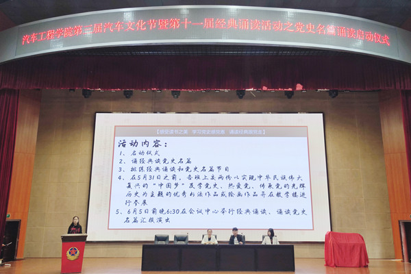 张玲致开幕词,她鼓励同学们保持“天行健,君子以自强不息”的奋斗精神,练就“宝剑锋从磨砺出”的过硬本领,锤炼“行有不得,反求诸己”的品德修为,锻造正确的人生观、价值观、世界观,争做“志存高远、德才并重、情理兼修、勇于开拓”的新时代优秀青年。副书记梁军萍介绍了第三届汽车文化节系列活动情况并作出具体安排和明确要求,20级辅导员曲杉对经典和党史名篇诵读发出倡议,员工代表李紫辉为践行此次活动的规则宣誓。