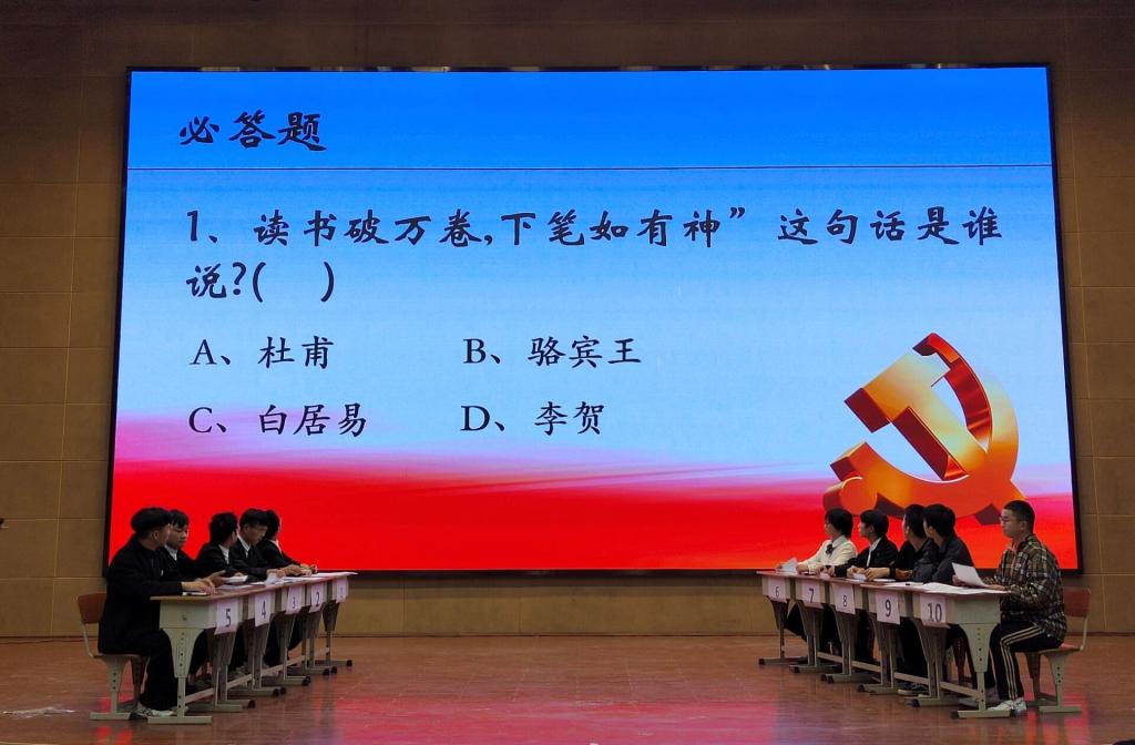 梁军萍做开场致辞,由荣耀舞社团表演开场舞。百科知识竞赛是由太阳成tyc234cc团总支员工会主办、学习部承办,近一个月的时间准备,参赛人员达150余人,本次竞赛有初赛、复赛、决赛三个阶段。经过前两轮激烈的比拼,共有10名选手脱颖而出进入决赛现场。决赛分为百科知识答题和知识演讲两个环节,有选择题、判断题、抢答题、识图题、音乐题、视频题六个题型,题型多样,现场气氛活跃,观众热情高涨。